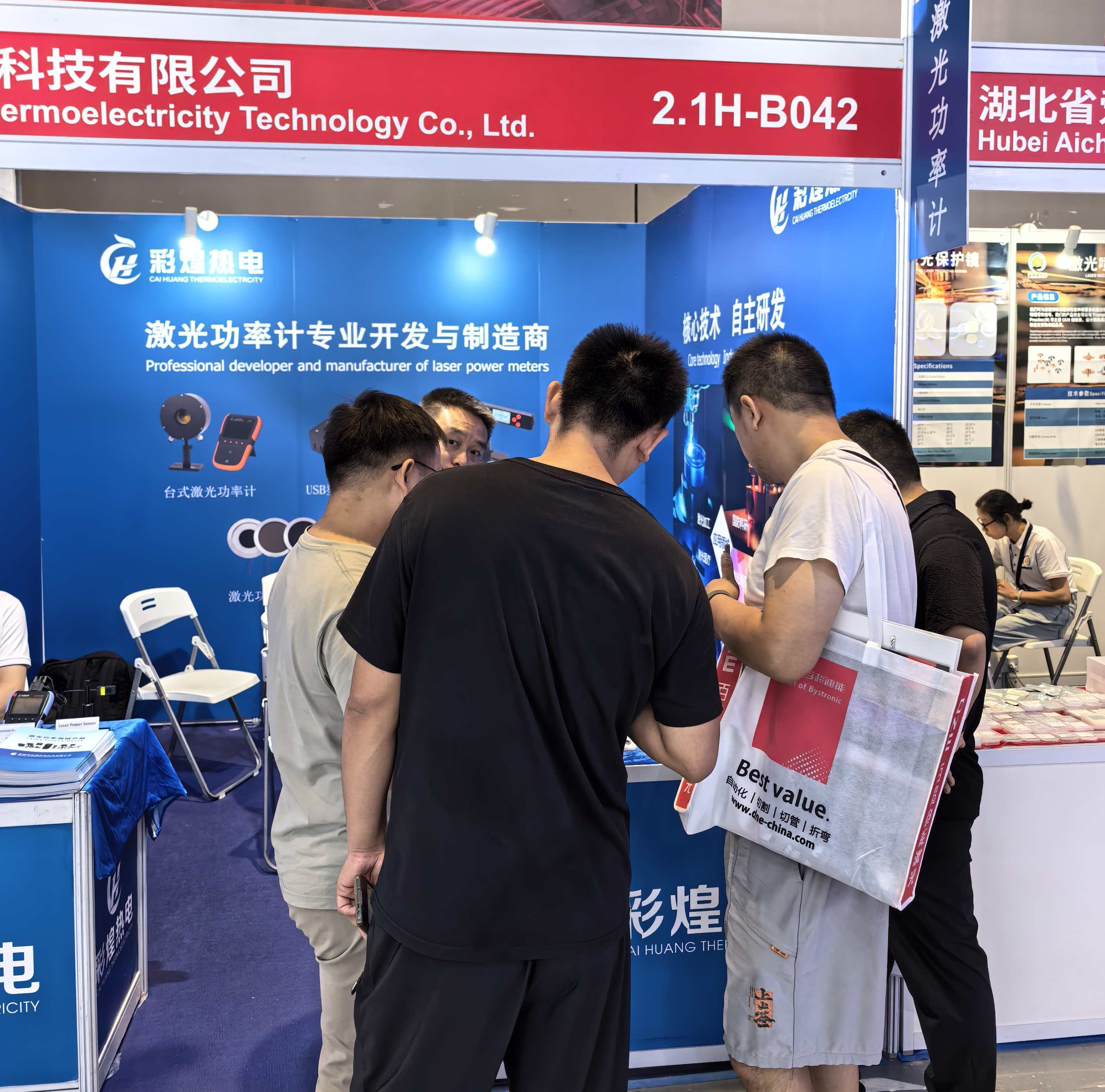 為增強觀眾參與感,彩煌熱電提供多種功率計樣品供現(xiàn)場測試。參觀者可親手操作功率計,直觀感受產(chǎn)品在測量一致性、響應速度等方面的卓越性能。我司工作人員圍繞激光加工中的功率監(jiān)測、安全校準、數(shù)據(jù)溯源等行業(yè)關切問題,與觀眾深入交流,展現(xiàn)彩煌熱電在激光測量領域的深厚積淀與技術服務能力。